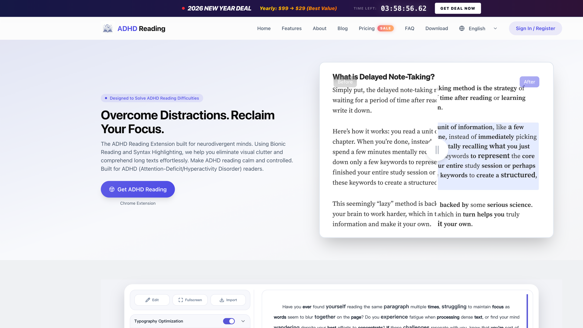 ADHD Reading is a groundbreaking Chrome extension specifically designed to transform the digital reading experience for individuals with attention and focus challenges, such as ADHD. It acts as an intelligent reading assistant that instantly reformats web text to reduce cognitive load and enhance comprehension.