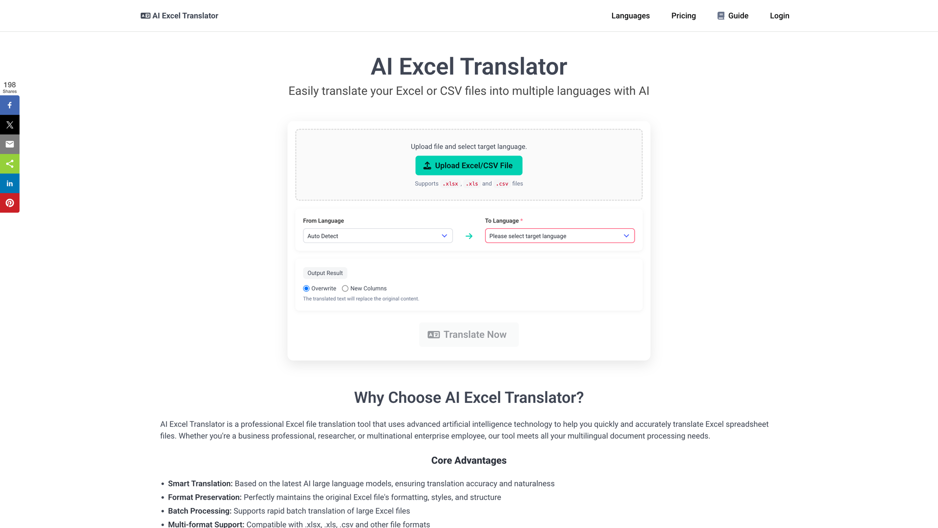 AI Excel Translator is a powerful, web-based platform designed to translate Excel and CSV files using advanced artificial intelligence technology. It caters to a wide range of users, including business professionals, researchers, and employees of multinational enterprises, by providing a seamless solution for multilingual document processing.