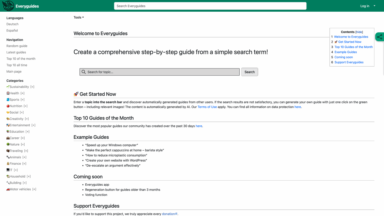 Everyguides is a community-supported project. If you find it valuable, you can contribute through donations, which are greatly appreciated to help maintain and improve the service.