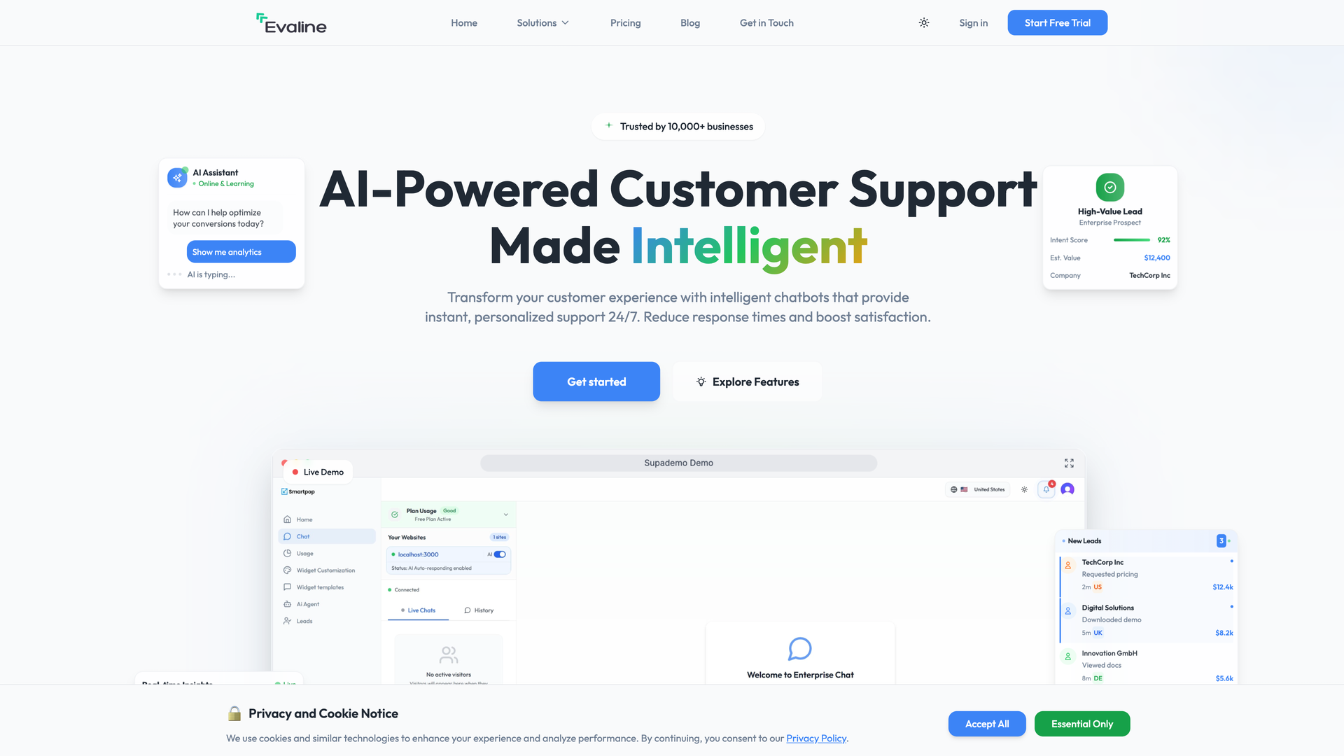 Evaline is built to help businesses of all sizes—from startups to enterprises—improve customer experience, reduce support response times from hours to seconds, capture leads, and ultimately boost conversion rates, particularly in e-commerce and retail environments.