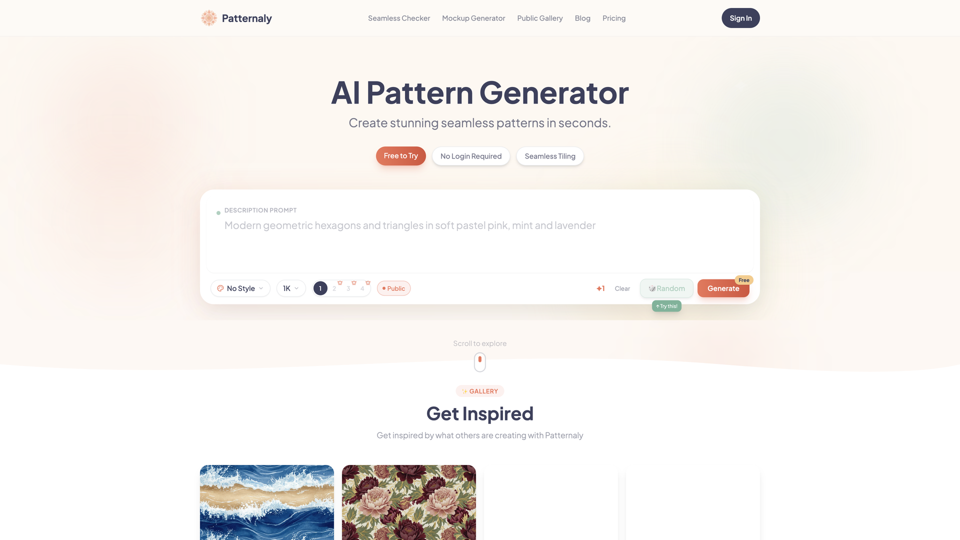 Paid plans allow for batch generation of 1-4 pattern variations at once. A public gallery showcases community creations, providing inspiration and allowing users to remix existing designs.