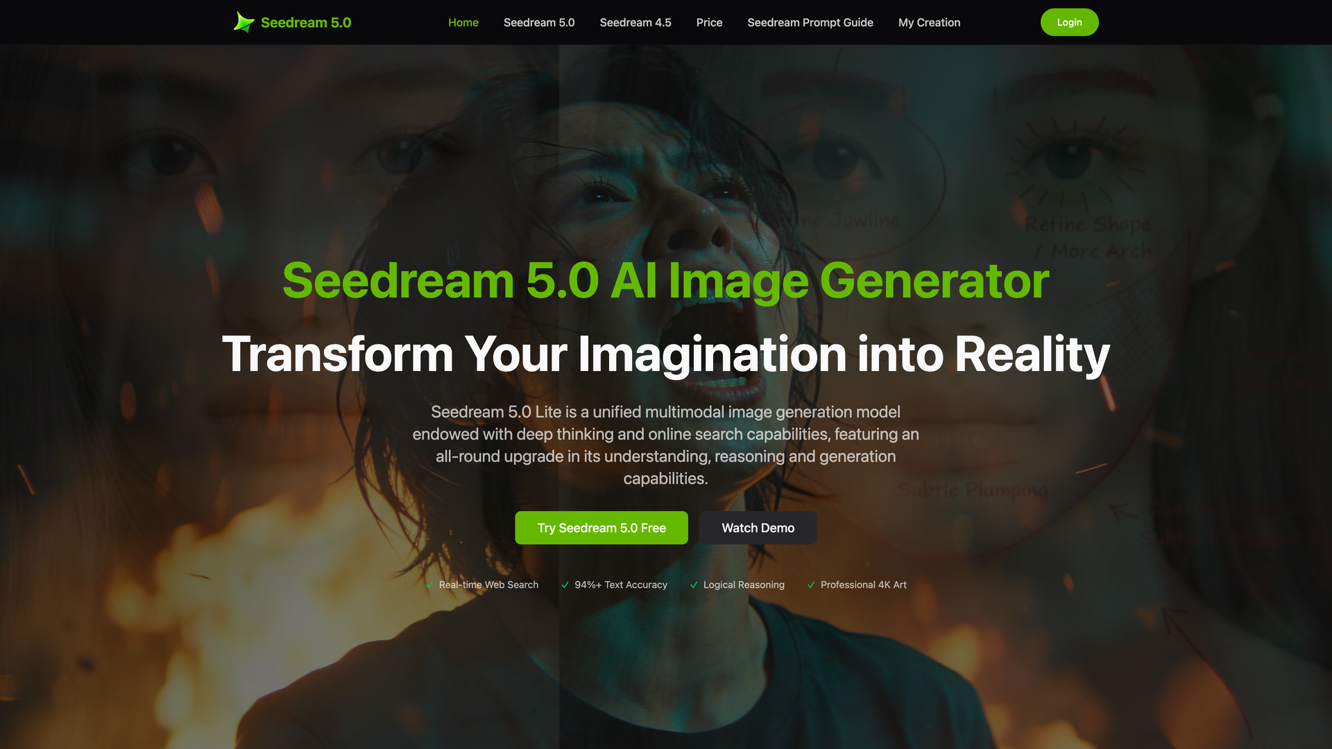 Seedream 5.0 is ByteDance's latest AI image generation technology, designed to transform your imagination into stunning 4K artwork. With real-time web search capabilities, 94%+ text accuracy, and advanced logical reasoning, Seedream 5.0 sets a new standard for AI-generated imagery.
