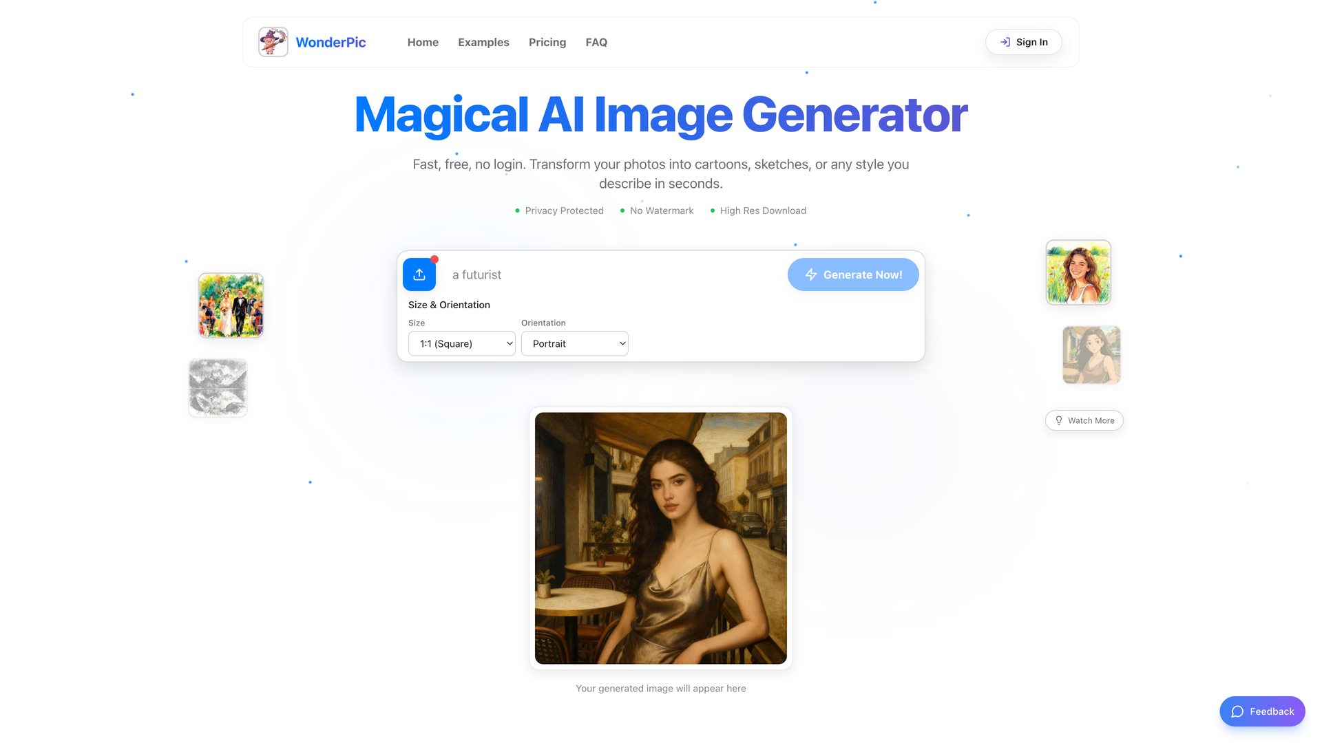 WonderPic prioritizes speed and accessibility. The service is free to start with no login required, allowing users to generate images almost instantly upon uploading a photo and selecting a style.